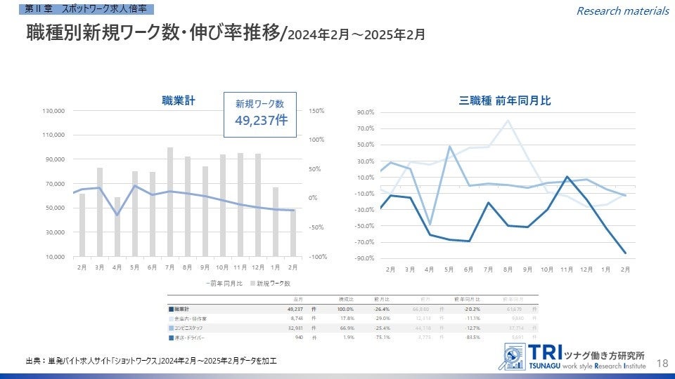 2. 新規ワーク数は49,237件で、前年同月比-20.2%と5か月連続で前年を下回る。