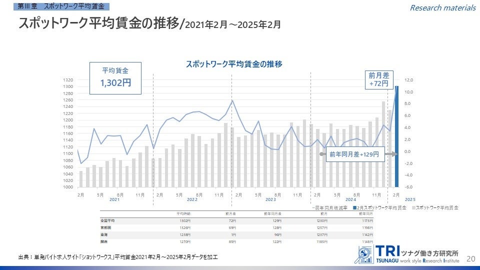 3. スポットワーカーの平均賃金は1,302円。初めて1300円を超え、過去最高額を更新。