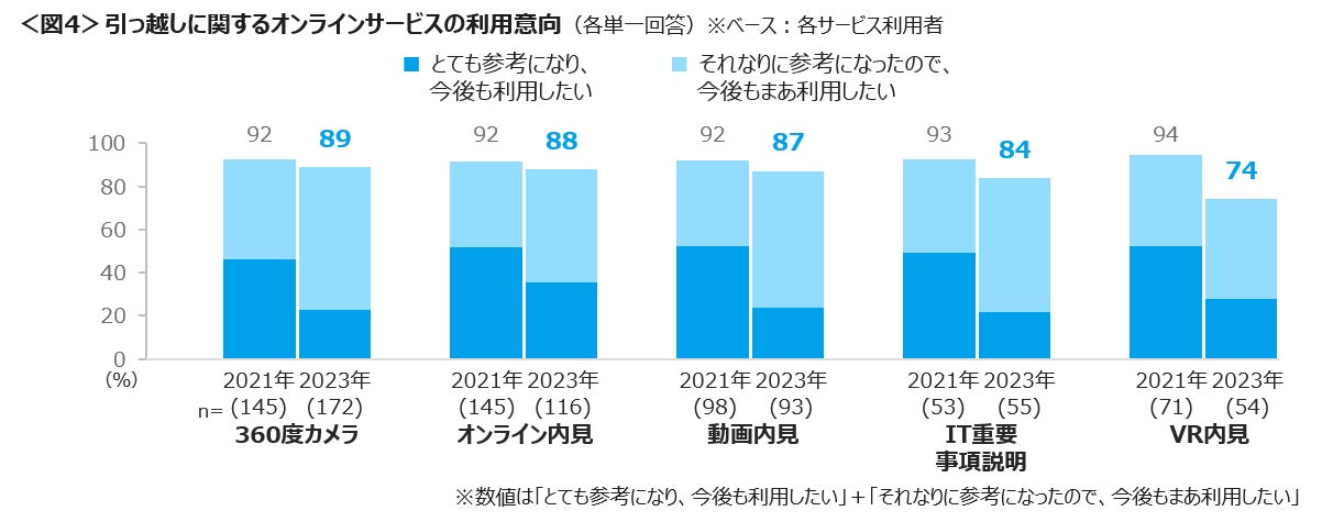 引っ越しに関わるオンラインサービスの利用率は33%。利用率が高いオンラインサービスは「360度カメラ」「オンライン内見」「動画内見」など。2021年と比べ、利用率や利用したサービスに大きな変わりはない。<図2,3>