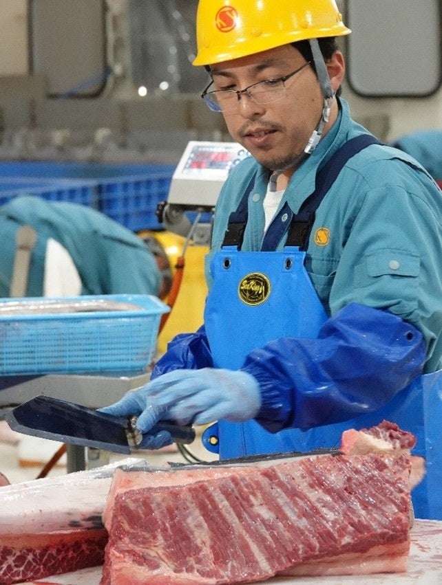 世界最大のシロナガスクジラの近縁種であるナガスクジラ。その肉質はもっちりときめ細かく、上質な脂がのります。今回は共同船舶の協力により、上質な尾の身の優先確保が実現しました。