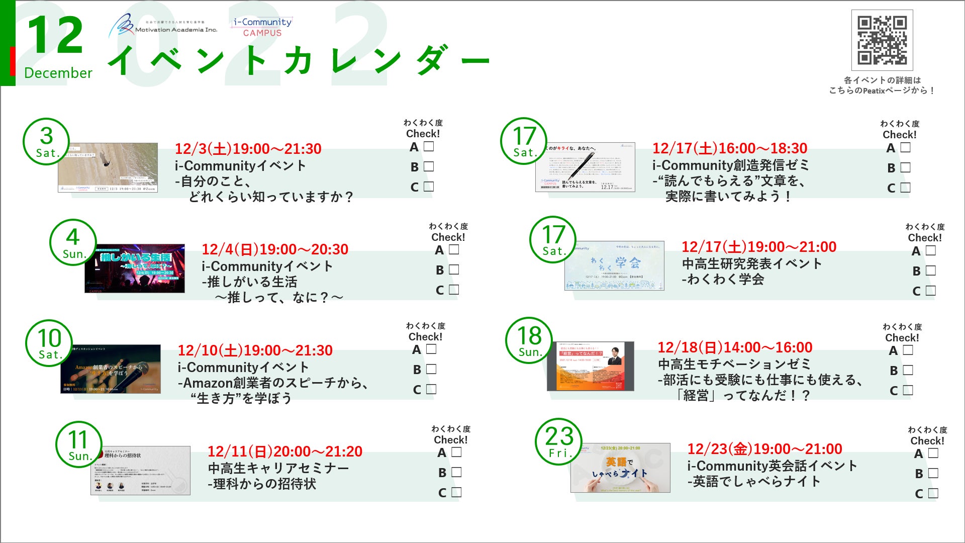 - やる気を伸ばす塾「モチアカ」の2022年12月開催イベント