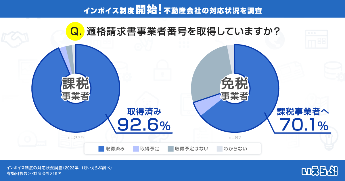 適格請求書発行事業者番号(以下、T番号)を取得済みかを尋ねたところ、課税事業者である不動産会社の92.6%が取得済みと回答しました。取得予定の割合を加えると95.6%です。また、免税事業者のうち70.1%がT番号を「取得済み」または「取得予定」であり、課税事業者へ転換する見込みです。中には「課税事業者へ転換したことにより受注が増えた」とのコメントもありました。