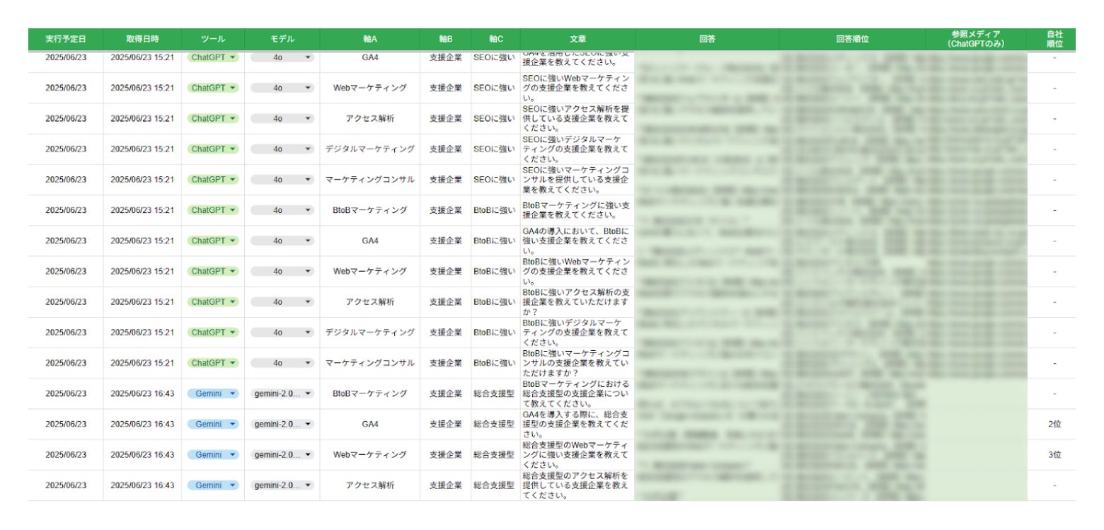 質問に対し、どのようなサービス名・企業名・WebページがAIによって回答されるかを自動取得・記録