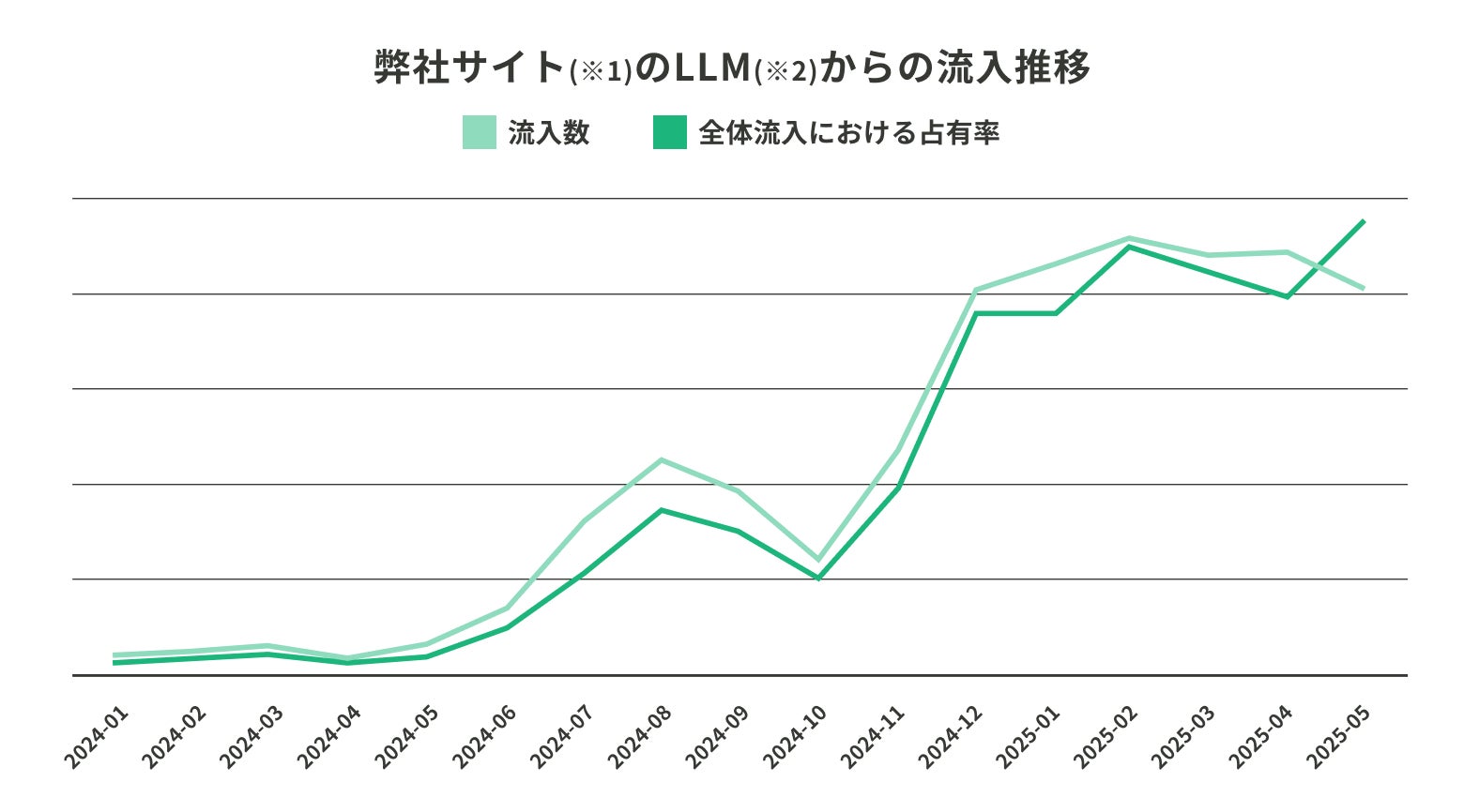 以下は弊社WebサイトへのLLMからの流入状況です。2024年5月頃を皮切りに、流入ボリュームは増加傾向にあります。