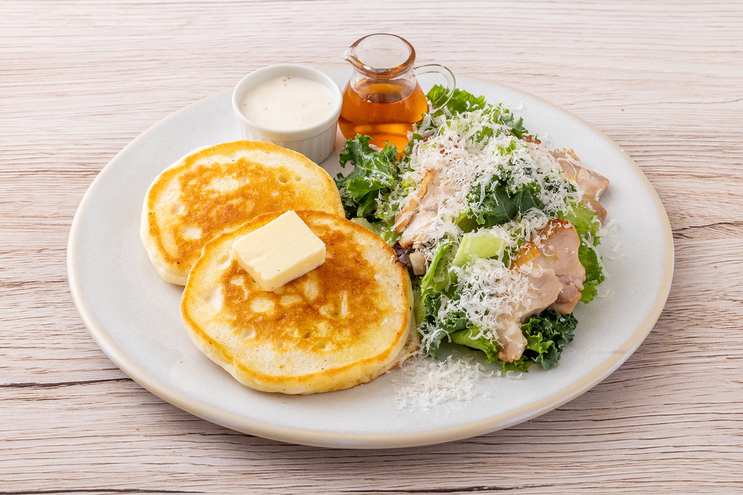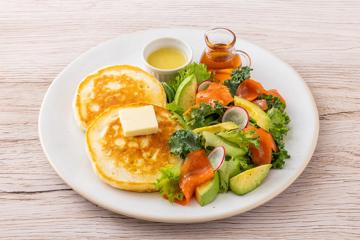 お食事としても楽しめる甘さ控えめのミールパンケーキが新登場。もち粉を練りこみ、丁寧に焼き上げたパンケーキにサーモンやアボカド、シーザーサラダなどヘルシーディッシュを添えました。やさしく素朴な味わいのミールパンケーキはどの食材とも相性抜群。お好みでメープルをかけてお召し上がりください。