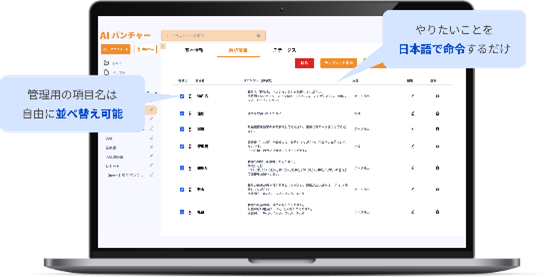 AIパンチャーオンプレミス版は、簡単な日本語入力だけでデータの仕分け・Excel化と資料作成を自動化するプログラミング不要のサービスです。設定画面に項目名と命令(プロンプト)を箇条書きで記入し、その命令を対応させたい情報・ファイルを読み取るだけで、後続の作業はAIが対応します。