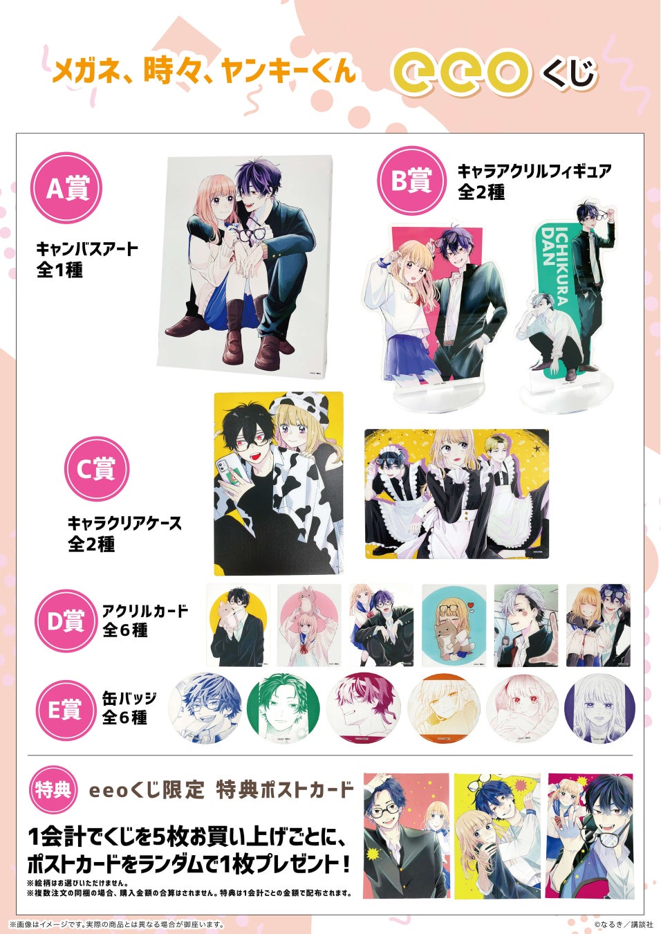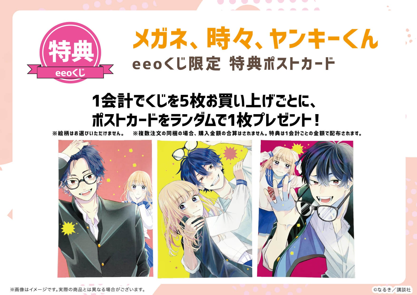 『メガネ、時々、ヤンキーくん』の「eeoくじ」を1会計5枚お買い上げごとに、ポストカード(コミックス表紙絵・全3種)をランダムでプレゼント。