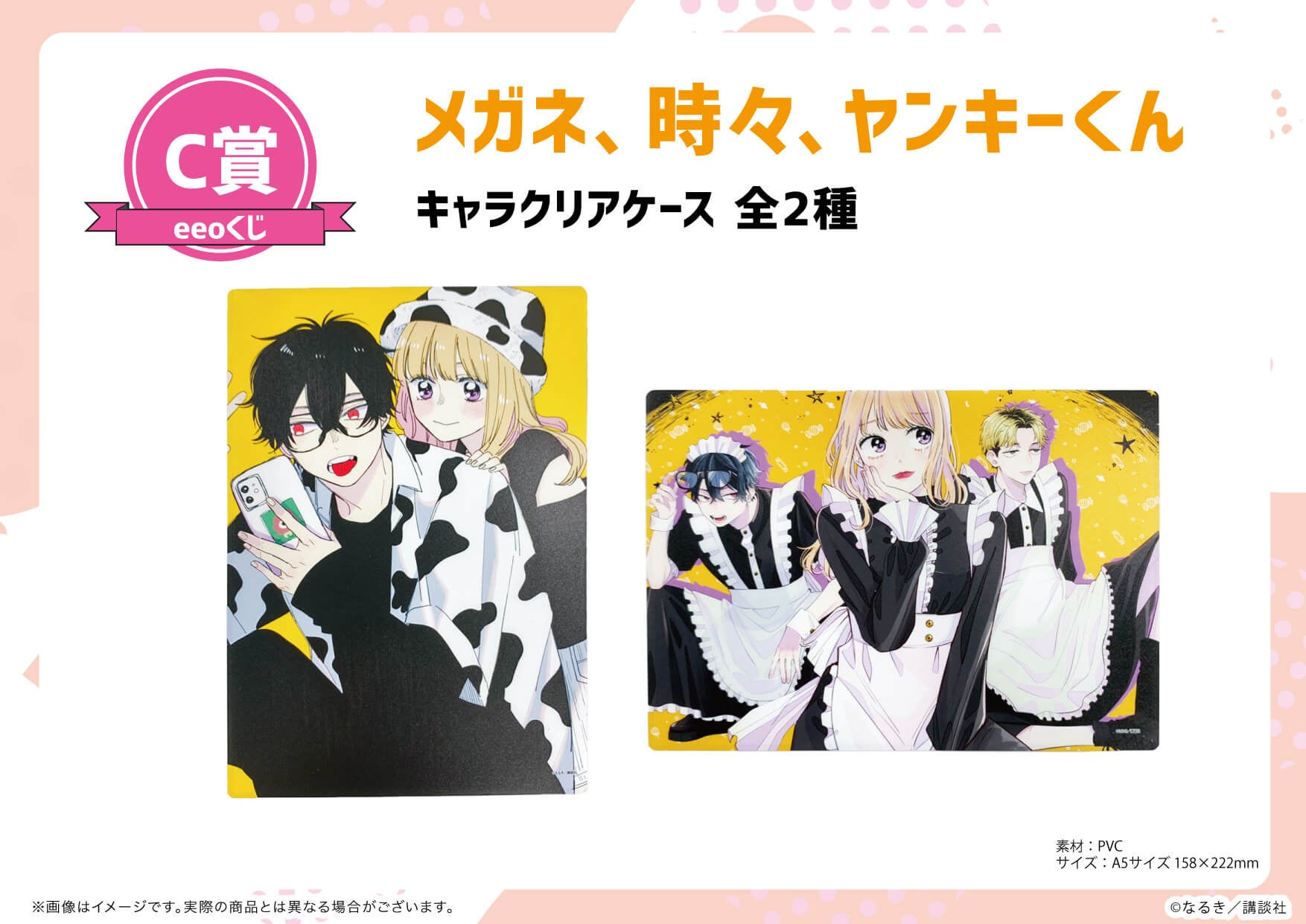 C賞に登場したキャラクリアケースは、「壱倉くん&百瀬ちゃんの牛柄お揃い衣装ver.」と「壱倉くん&百瀬ちゃん&五十嵐くんのメイド衣装ver.」の全2種がラインナップ(上記画像を参照)。