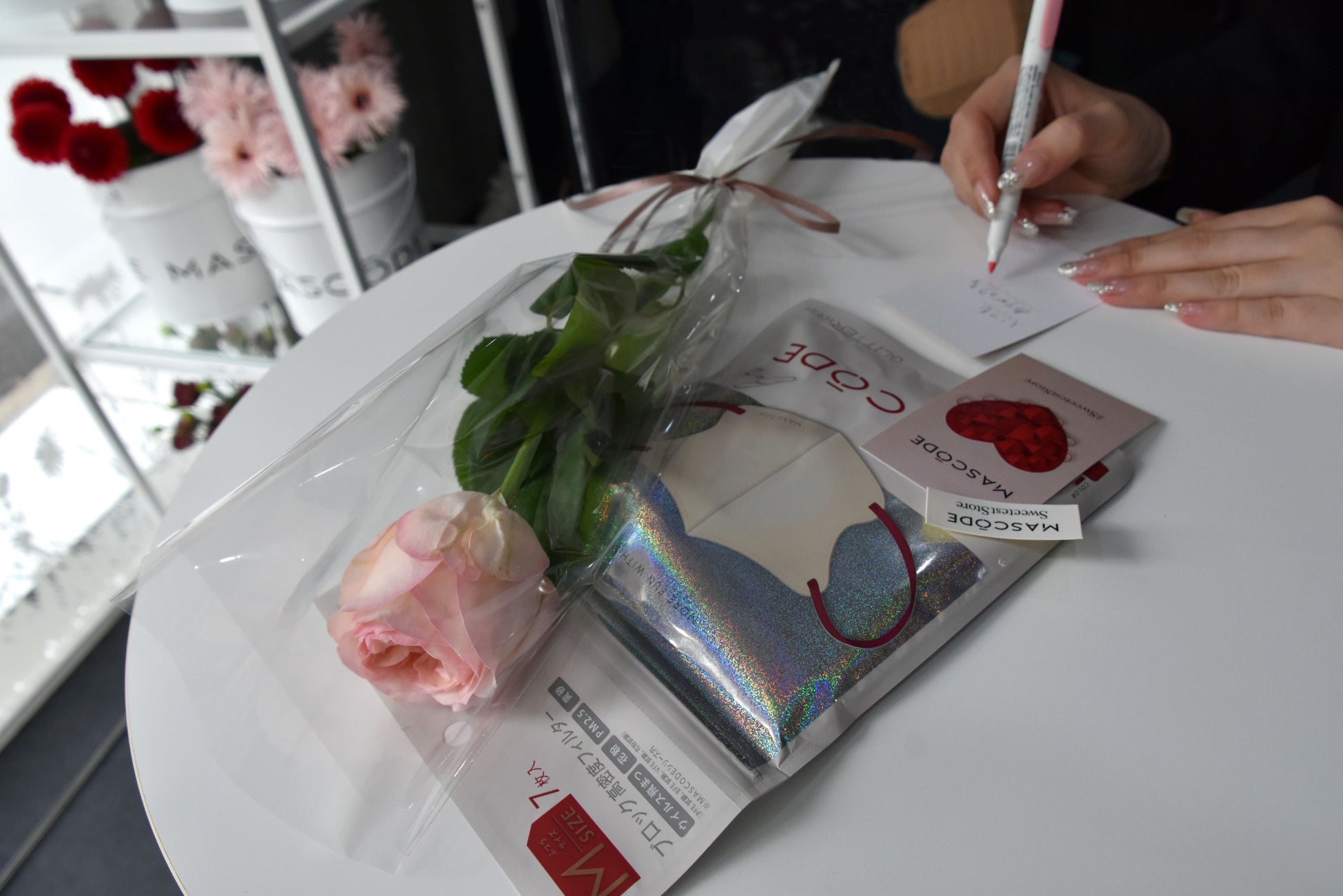 店内はMASCODEの数多のカラーバリエーションからマスクを選べる2階と、ご自身で選んだマスクとお花をギフトにすることができる1階で構成されました。2階でマスクを購入いただいた方に、お好きなお花とメッセージカードをお渡しし、1階のカウンターにてメッセージを記入しギフトをお作りいただきました。