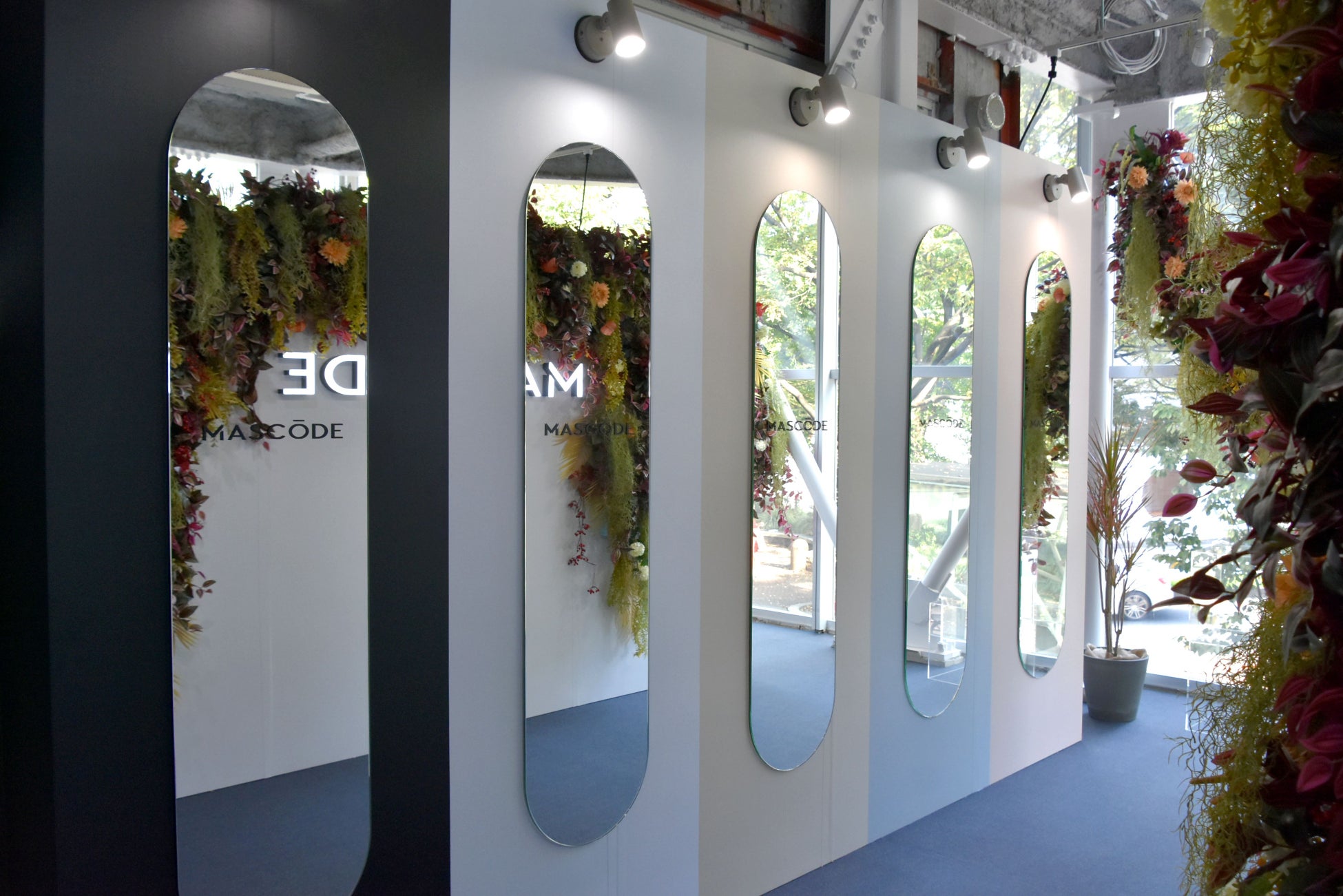 また、2階にはギフトで贈る花々や植物が彩るミラーのフォトブースを設けました。MASCODE公式InstagramのフォローでMASCODEマスクを一枚、さらに公式LINEの友達登録でMASCODE1セット(7枚入り)をプレゼントし、フォトブースにて多くの人に撮影をしていただきました。
