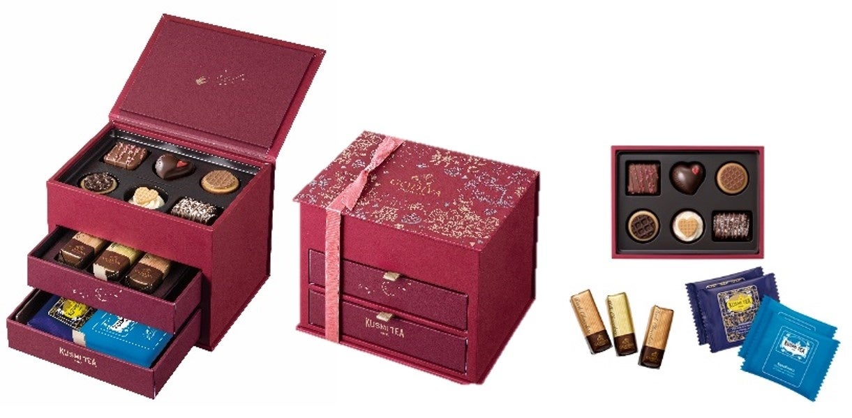 コレクションを象徴するモチーフを金と銀の箔で表現したエレガントでプレミアム感のある3段のパッケージです。上段には限定チョコレート、中段にはミルフィーユショコラ、下段にはKUSMI TEAの紅茶のセットが入っています。お茶とチョコレートと焼き菓子で優美なティータイムを楽しめるアソートです。