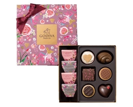 レディ・ゴディバ、フラワー、ハート形のワッフルなど、コレクションを象徴するモチーフを散りばめたパッケージに、「ルビーストロベリームース」などバラエティ豊かなG キューブを詰め合わせました。