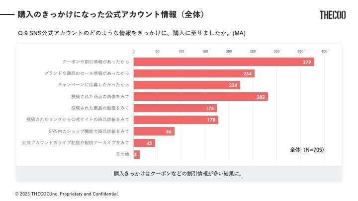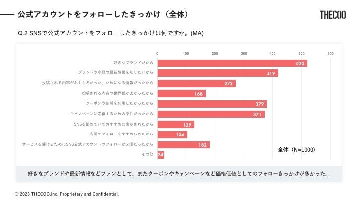 公式アカウントのフォローきっかけとして多かった理由、「好きなブランドだから」「ブランドや商品の最新情を知りたいから」というブランドのファンであることと、「クーポンや割引を利用したいから」「キャンペーンに応募するための条件だから」という金銭的価値の2つに分かれた。