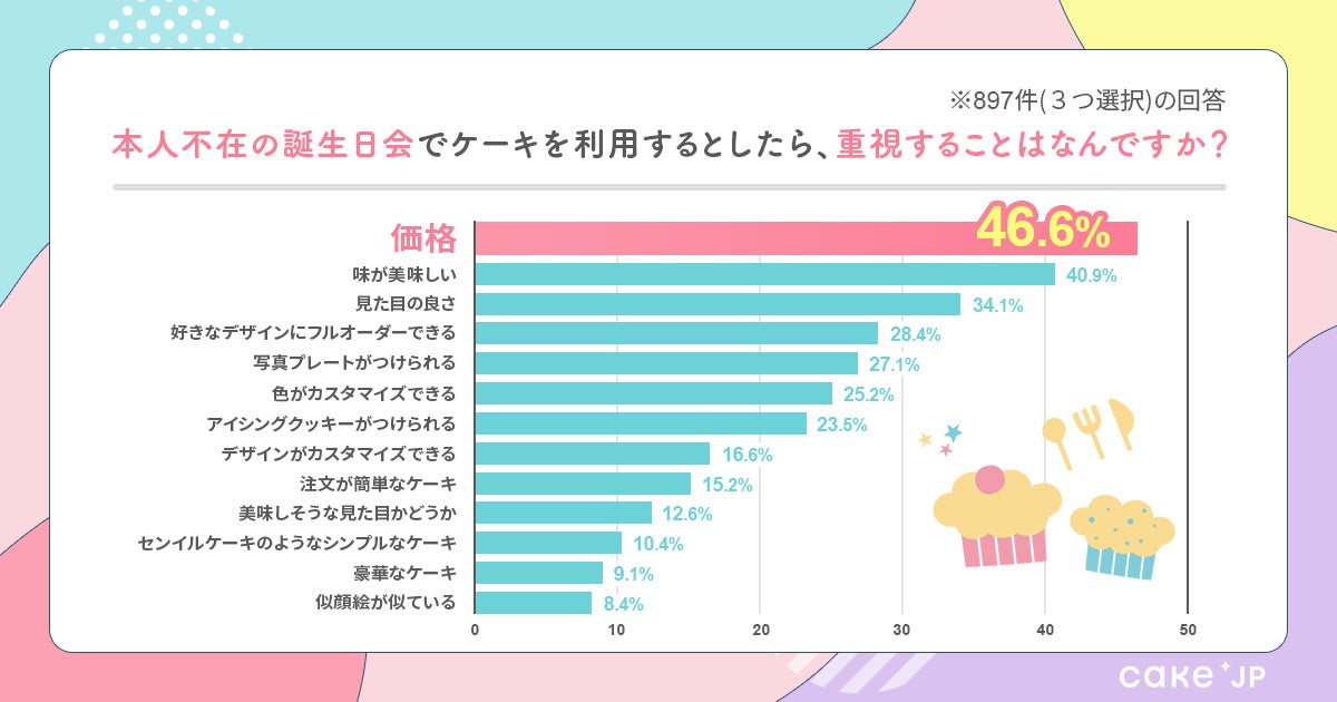 ケーキ選びで最も重要視しているのが、「価格」と答えた方が46.6%と最も多い結果に。続いて「味が美味しい(40.9%)」となり、SNSの発信のために「見た目の良さ」は重要ですが、せっかく用意したケーキをご自身で味わうためにも、美味しさにもこだわりたい方が多いことが分かりました。