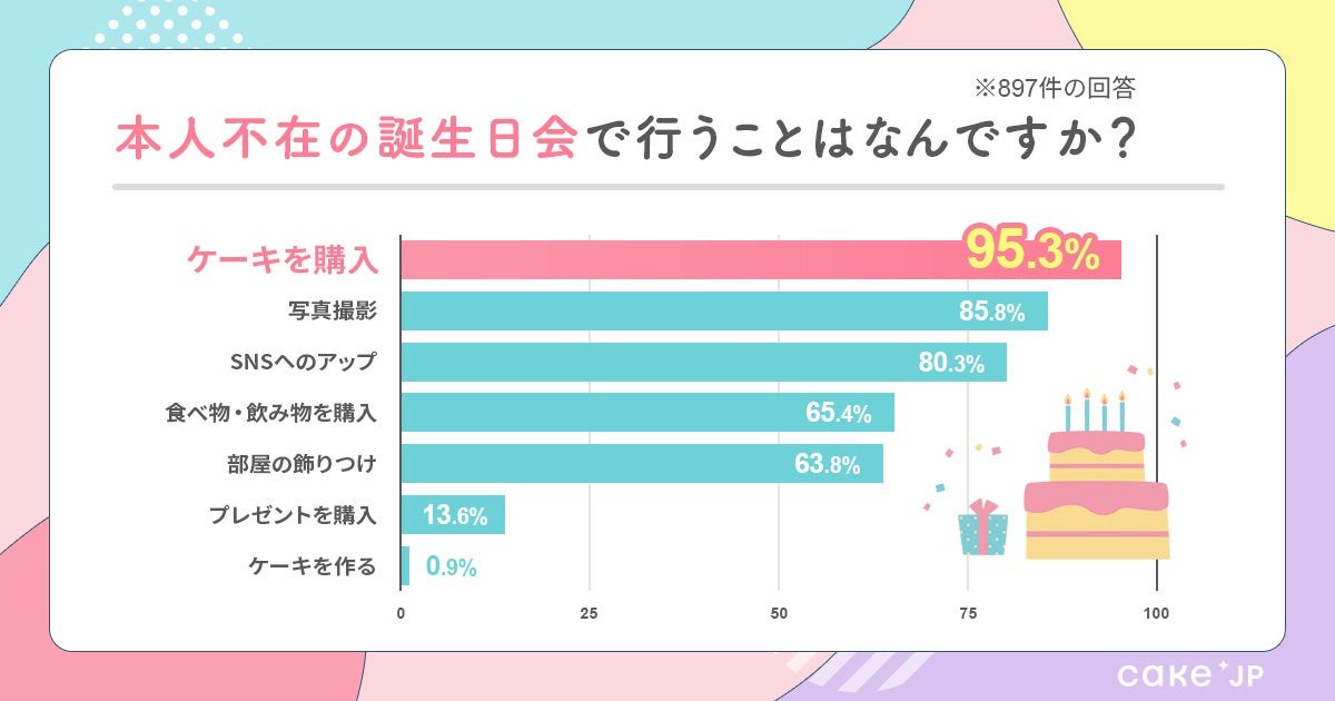 - 「本人不在の誕生日会」で実施すること1位「ケーキを購入」2位「写真撮影」3位「SNSへのアップ」。推しの誕生日をSNSで発信したい人が多数!