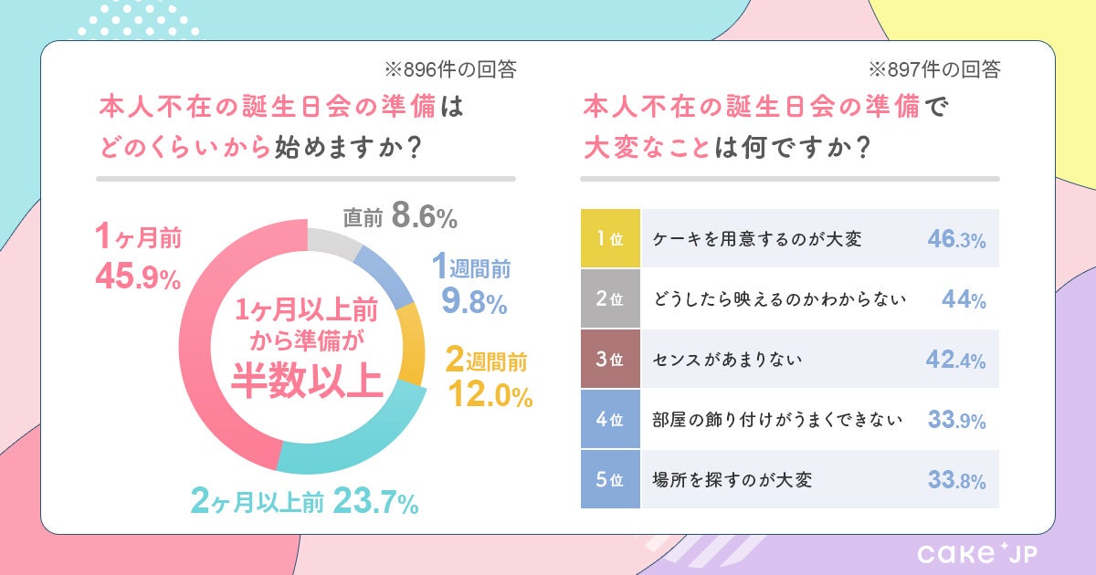 - 「本人不在の誕生日会」の準備に1か月以上かける人が約69%と気合十分だが、ケーキを用意するのが大変と感じている人が約46%。