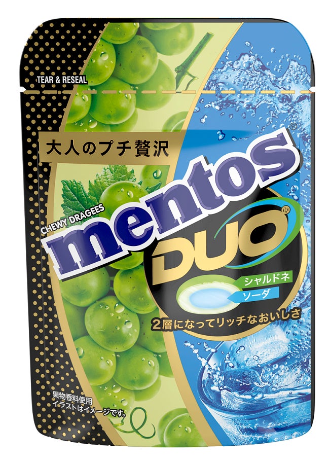 「メントス DUO シャルドネ&ソーダ」は、大人のプチ贅沢が叶うフレーバーとして、ワインなどで使用されるグレープの品種「シャルドネ」に着目し開発いたしました。外側がカリッとした食感のフルーティーなシャルドネ味、内側は爽快感のあるソーダ味の2層でリッチな味わいに仕上げています。噛んだ瞬間、シャルドネとソーダのジューシーなおいしさを同時に楽しめ、ひらめきとワクワクする心が目覚めます。