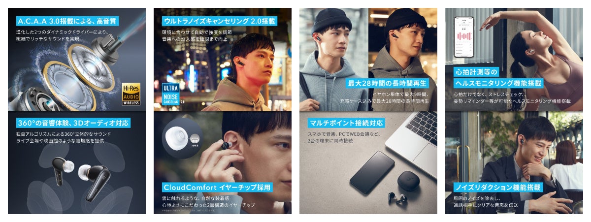 Soundcore アプリで使える機能も拡充し、心拍モニタリング、ストレスチェック、姿勢リマインダー、ワークアウト機能等を確認できるヘルスモニタリング機能を新たに搭載しました。また使用環境にもこだわり、Anker独自の2層構造CloudComfortイヤーチップにより、快適に使用できるつけ心地も追求しました。音楽を最大限に楽しめるようSoundcoreの技術を集約し、お客さまの欲しい機能すべてを搭載したAnker史上最高傑作です。