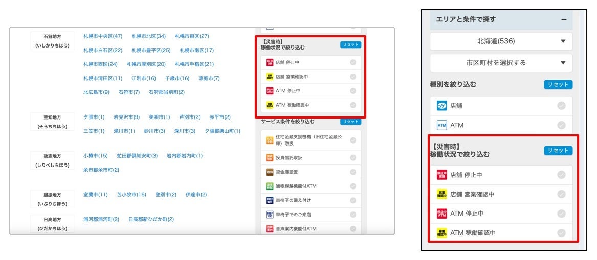 今回提供されるシステムは、災害発生時などお客様の生活に大きな影響を及ぼす事象が発生した際、北洋銀行ホームページ(PCおよびスマートフォン版)の店舗・ATM検索にて確認いただけます。