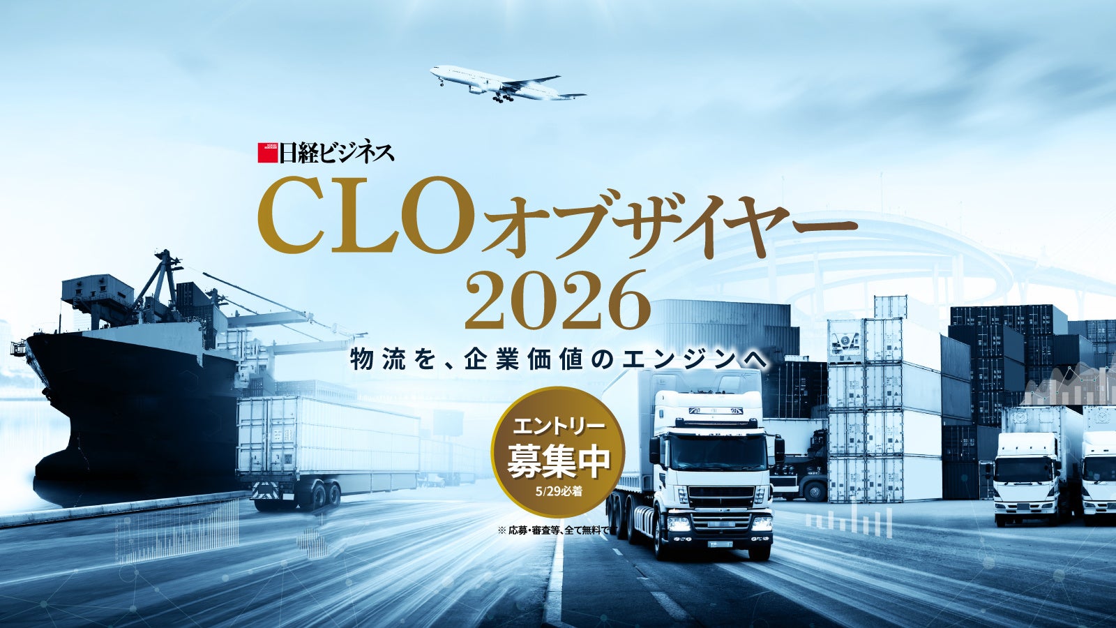 そして義務化が正式にスタートする本年も、第2回として「CLOオブザイヤー 2026」を開催します。日経ビジネスは、本アワードを通じて、“人と社会を幸せにする”優良事例を紹介し、日本全体で持続可能な物流を目指してまいります。ぜひ趣旨にご賛同いただき、ご協賛をご検討いただけますようお願い申し上げます。