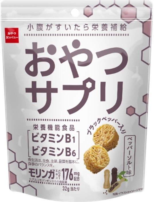 「食と健康アワード2023」にて準大賞を受賞した「おやつサプリ(ペッパーソルト味)」は、ビタミンB₁とビタミンB₆の栄養機能食品で、1袋(32g)にモリンガエキスパウダーを176mg(グルコモリンギンからの換算値)を配合。ブラックペッパーを混ぜ込んだ一口サイズのザクザクビッツを、香り高いペッパーソルトフレーバーで味付けしています。