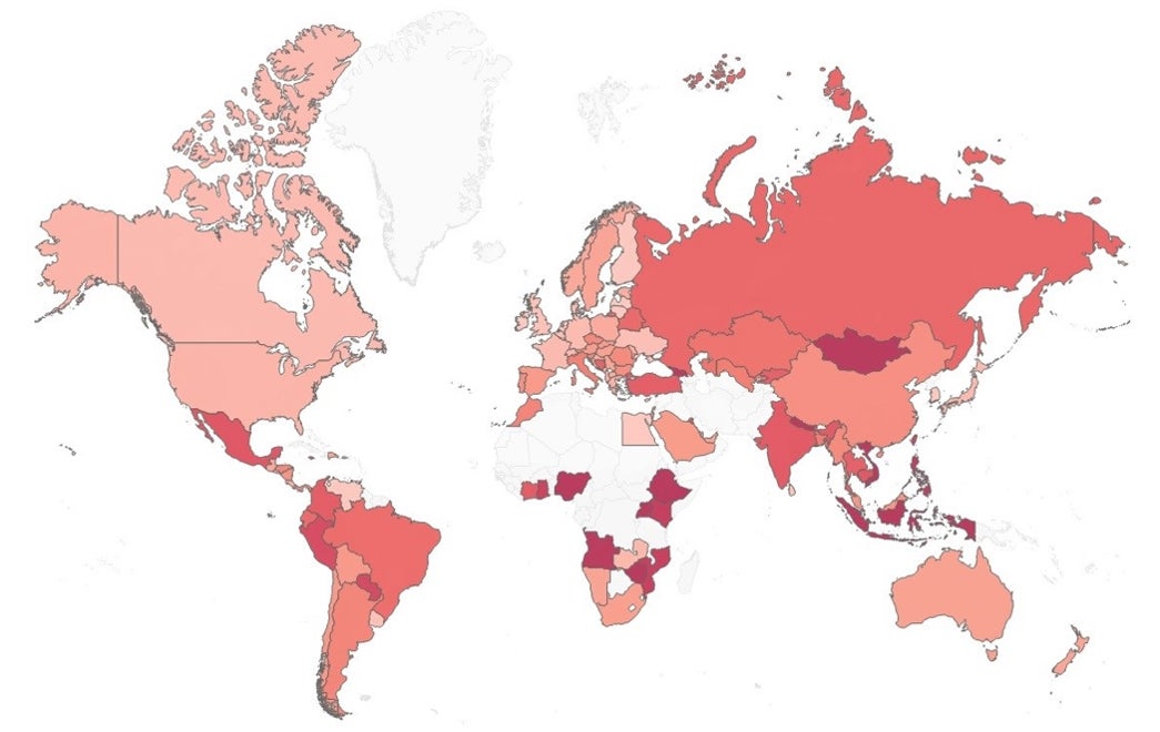 下の地図は、世界のリスク指数(濃い赤色ほどリスクが高い)を示したもので、主な高リスク地域が把握できます。
