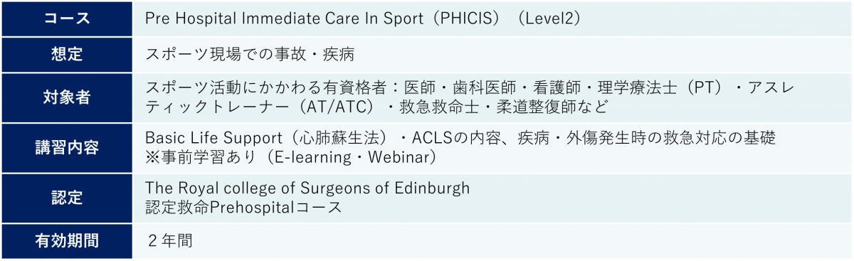 Pre Hospital Immediate Care In Sport(PHICIS)コースは、“スポーツ現場における病院前医療”の標準化を図ることを目的に実施されている国際資格の講習です。スポーツに関わる一般の方を対象としたLevel1から、医療従事者を対象としたLevel2、Level3まで3つのコースがあり、コースを修了すると英国のエジンバラ王立大学にPHICIS修了者として登録されます。日本では現在、Level2、Level3合わせて約300名(2021年12月現在)の医療従事者がコースを修了しており、これまでにラグビーワールドカップ2019日本大会やTOKYO2020オリンピック・パラリンピックなど、トップレベルのスポーツ現場でアスリートのメディカルサポートに携わってきました。