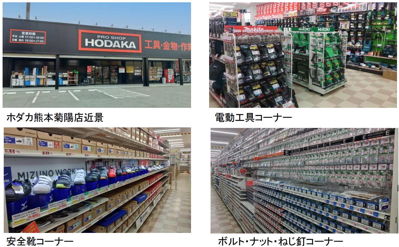 ホダカは、工具・金物・作業用品の「プロ向け専門店」として、2008年8月より事業を開始しました。現在では北海道から九州まで広域で展開しています。今回開店するホダカ熊本菊陽店は、熊本県では初出店、ホダカ全店で69店舗目の出店です。