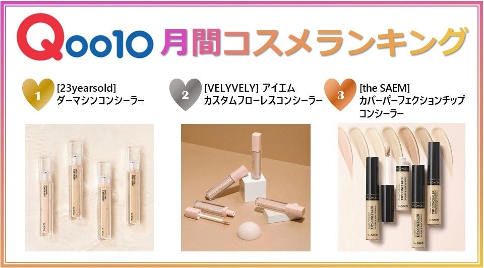 Qoo10(https://www.qoo10.jp/)サイト上、「コンシーラー」「リップ」「アイシャドウ」「チーク」カテゴリーの各販売個数に基づいたランキングです。