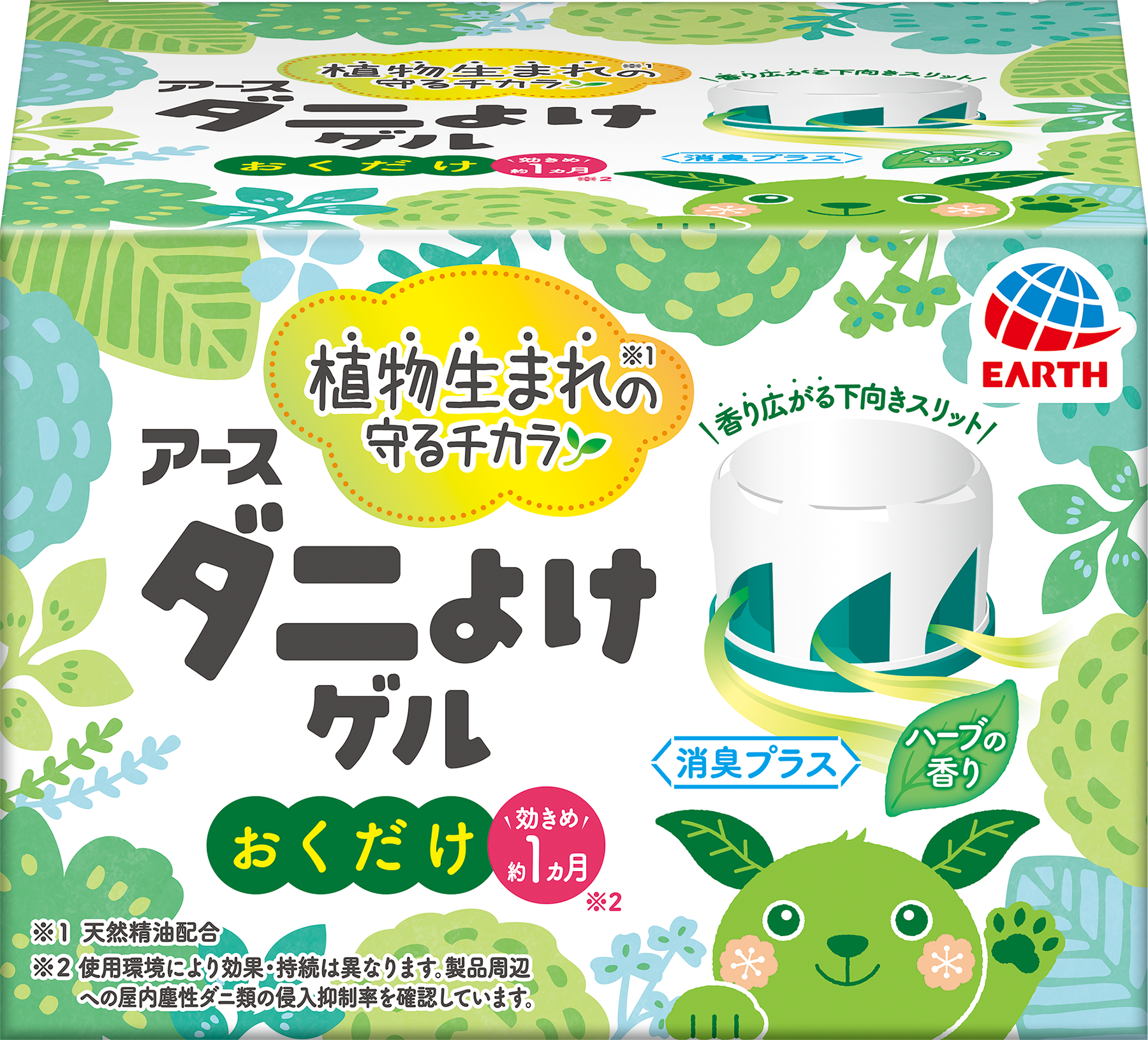 ダニよけ効果の持続が従来の約1.5ヵ月から約2ヵ月にアップ※2。ダニよけ成分に加え、消臭・除菌・防カビ・ウイルス除去※3・ハウスダスト除去成分※4も配合。香りが残りにくいハーブの香りです。