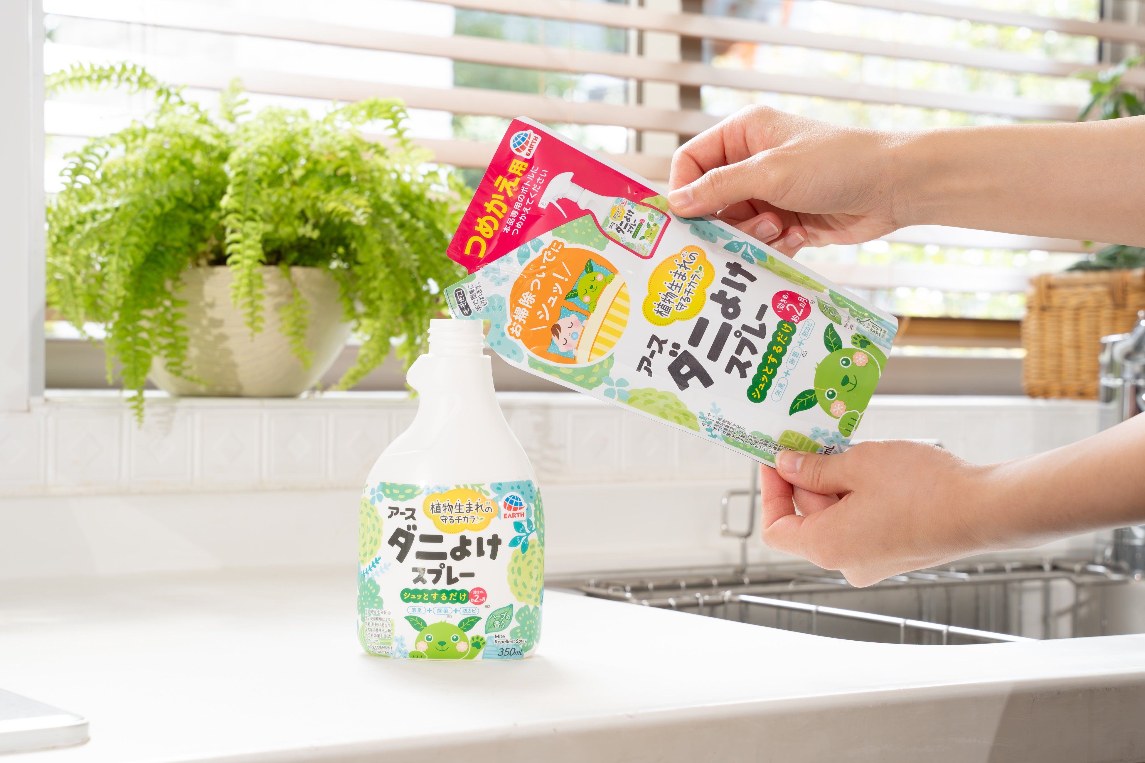 ダニ(ヒョウヒダニ類)は、人のフケやアカ、汗などをエサとして家の中で一年中生息すると言われており、気温25~30度、湿度60~80%の高温多湿を好みます。これからの季節は特にダニの繁殖が加速するため、定期的な対策が重要です。そこで当社は、手軽にダニ対策ができる『アースダニよけスプレー』に、繰り返し使えて環境にもやさしいつめかえ用を新たにラインナップしました。容器を捨てずにサステナブルに長くお使いいただけます。