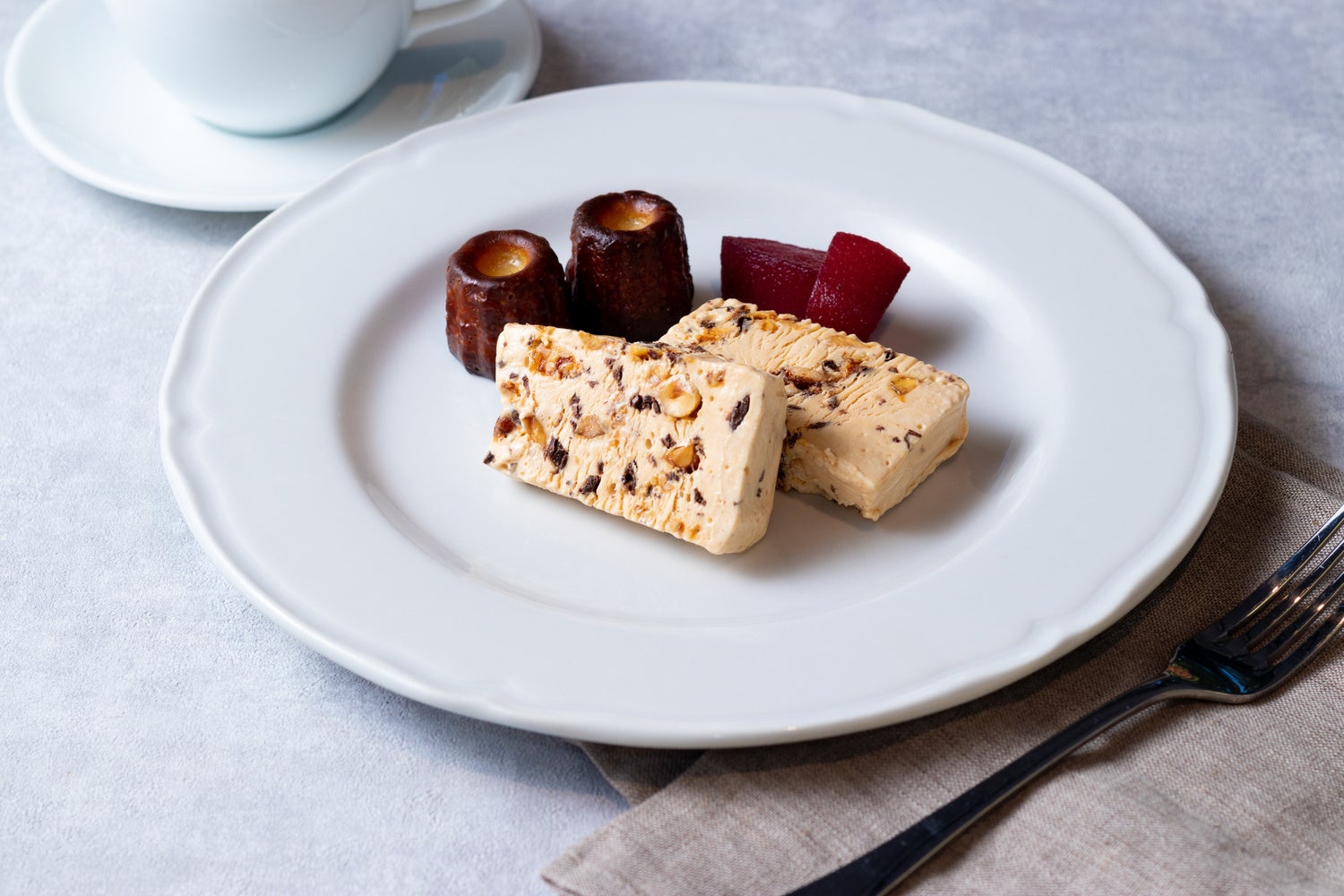 キャラメルナッツのセミフレッド 洋梨のコンポート カヌレを添えて