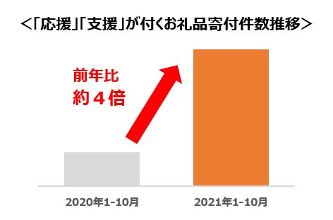 また、規格外や傷があるお礼品、外食業向けの在庫の滞留で内容量を増量した「訳あり」と付くお礼品の登録数と寄付件数は2021年1月~10月にかけて前年同期比で登録数は約3.8倍、寄付件数は約2.7倍に伸長しました。