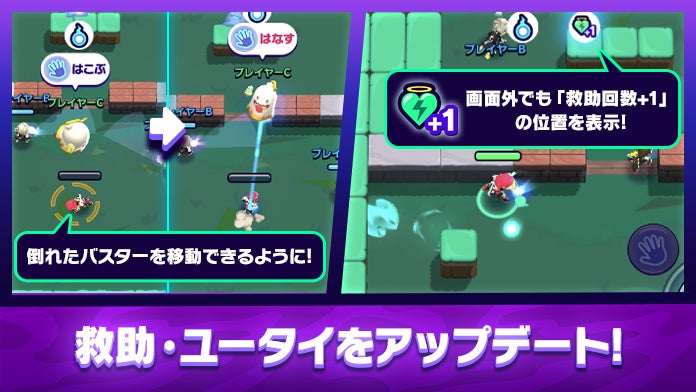 ユータイ操作時に、倒れたバスター自身を移動できるようになります。また、救助回数+1アイテムが、画面外でもアイコンで表示されるようになります。