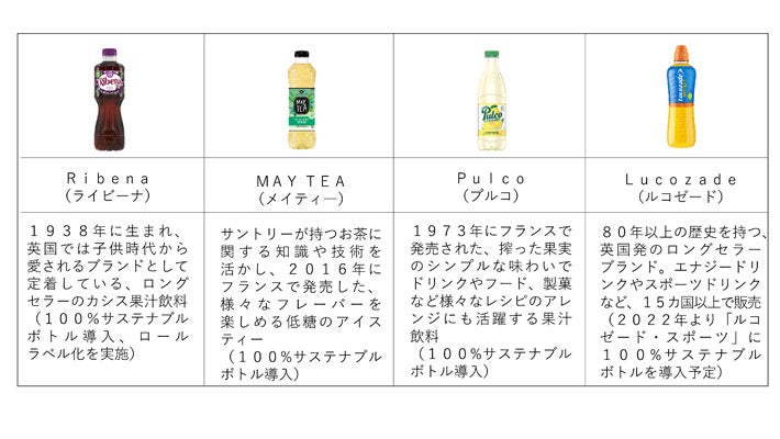 イギリスですでに100%サステナブルボトルを導入している「Ribena」につづき、2021年にはフランスで「MAY TEA」及び「Pulco」に100%サステナブルボトルを導入しました。