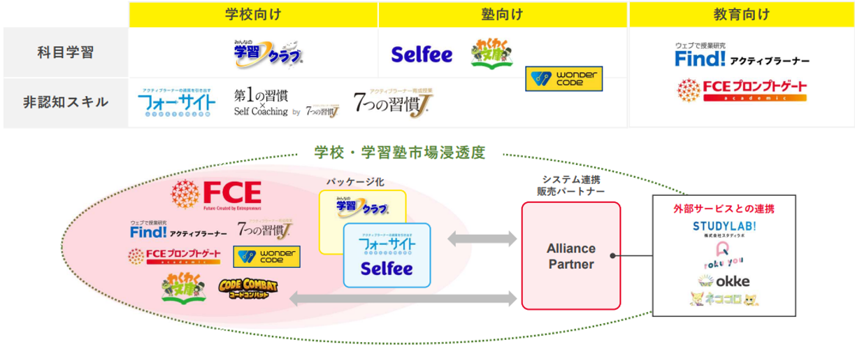 全国の学校や学習塾を対象に、様々なソリューションを提供しています。例えば「7つの習慣J®」シリーズは、世界的ベストセラー『7つの習慣』をベースにした、子どもたちがよく体験する課題や悩みを一緒に解決し、望む人生を実現するために必要な「生きる力」を育てるプログラムです。また、小中高生向け手帳「フォーサイト」は、生徒の『振り返り力』の向上を目的に開発され、全国1,200校以上、累計259万人の児童・生徒に利用されています。子どもたちの自信と主体性を育むプログラムの提供と、教育現場のDX化によって、子どもたちと先生に新たな可能性を提供します。