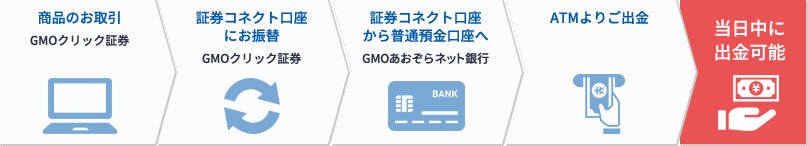 また、証券取引口座から証券コネクト口座・普通預金口座へと振り替えていただくことで、FXの売却益・スワップ益や、株式の配当金など受け取った取引益を即日ATMから引き出すことも可能です。