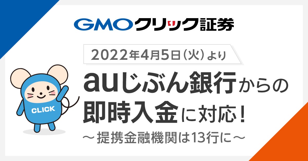 GMOインターネットグループのGMOフィナンシャルホールディングス株式会社の連結会社で、金融商品取引業を営むGMOクリック証券株式会社(本社:東京都渋谷区、代表取締役社長:鬼頭 弘泰、以下:当社)は、「即時入金サービス」を拡充し、2022年4月5日(火)より、auじぶん銀行からの即時入金に対応しましたので、お知らせいたします。今回のauじぶん銀行との提携によって、当社即時入金サービスの提携金融機関は13行となりました。