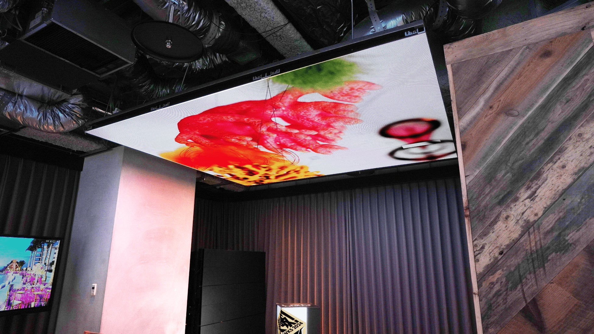 エントランス左手にはピッチ2.6mmを採用したW9m×H2.5mの大型LEDビジョンを設置しています。映像はLED.ART作品を放映しており、LED専門アーティストの作品が大画面で映し出されています。