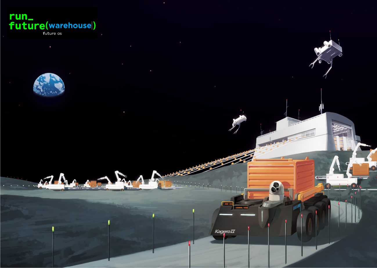 宇宙やメカへの深い知見を持ち、物語性のある一枚絵を得意とするイラストレーター・コケゴウ氏を起用。アニメーターとしての経験に裏打ちされた精緻な描写力によって、月面という極限環境の中で自律ロボットたちが協調して稼働するスマート倉庫の風景をリアリティと壮大さを兼ね備えた形で描き出しています。「ロボットが自律的に物流を担う月面拠点」という未来のビジョンを、技術思想の延長線上に可視化し、イラストとFMS技術の世界観が交差するかたちで表現しています。