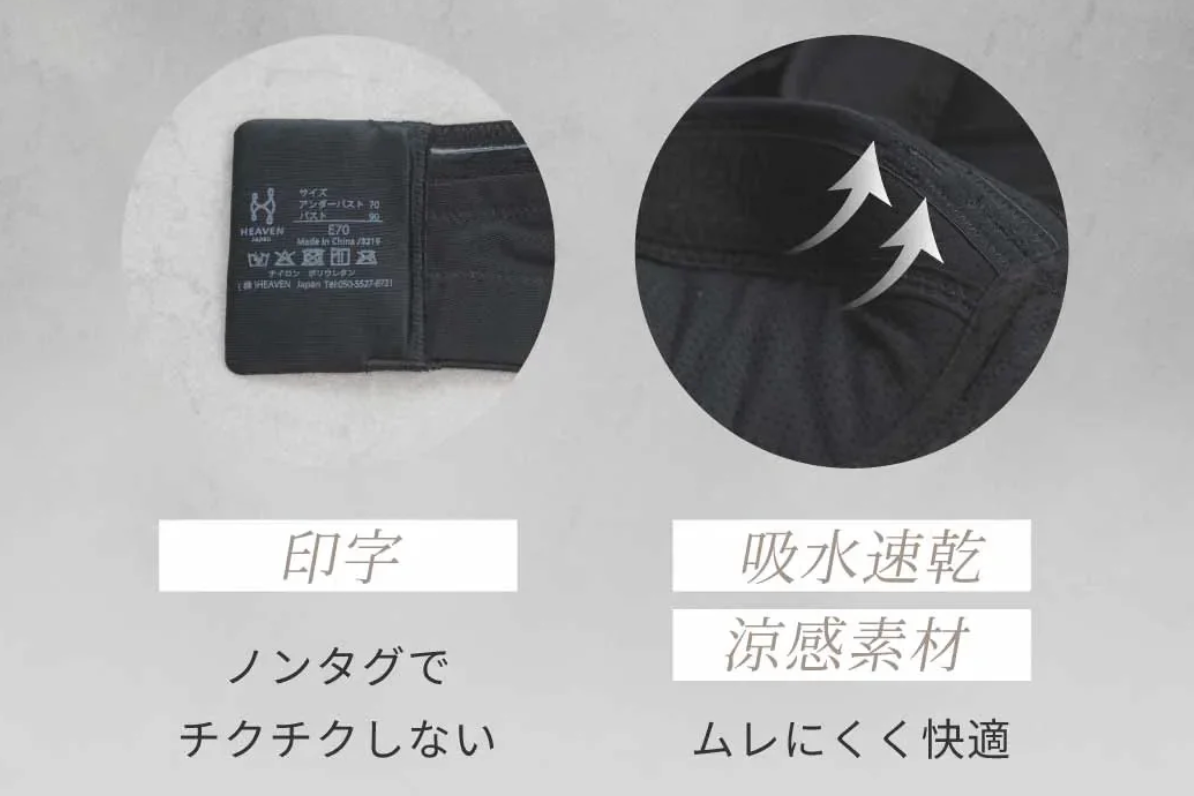 洗濯表記は印字仕様で密着度の高いブラジャーでも、チクチクせず快適に着用できます。また、汗をかく季節に着用することの多いストラップレスブラですが、吸水速乾の涼感素材を使用しているためムレにくくなっています。