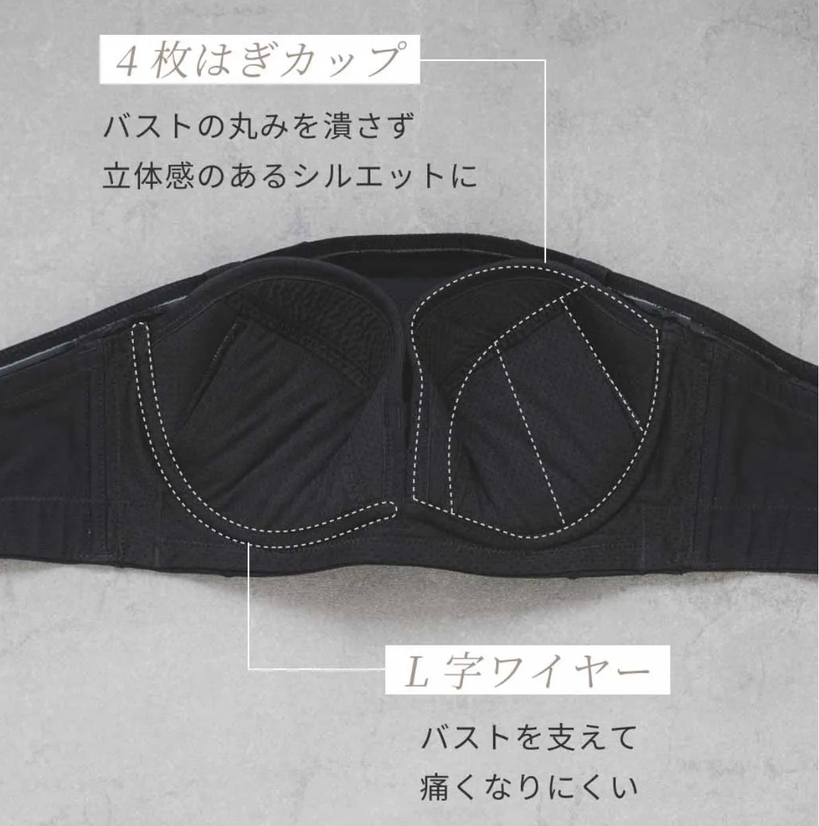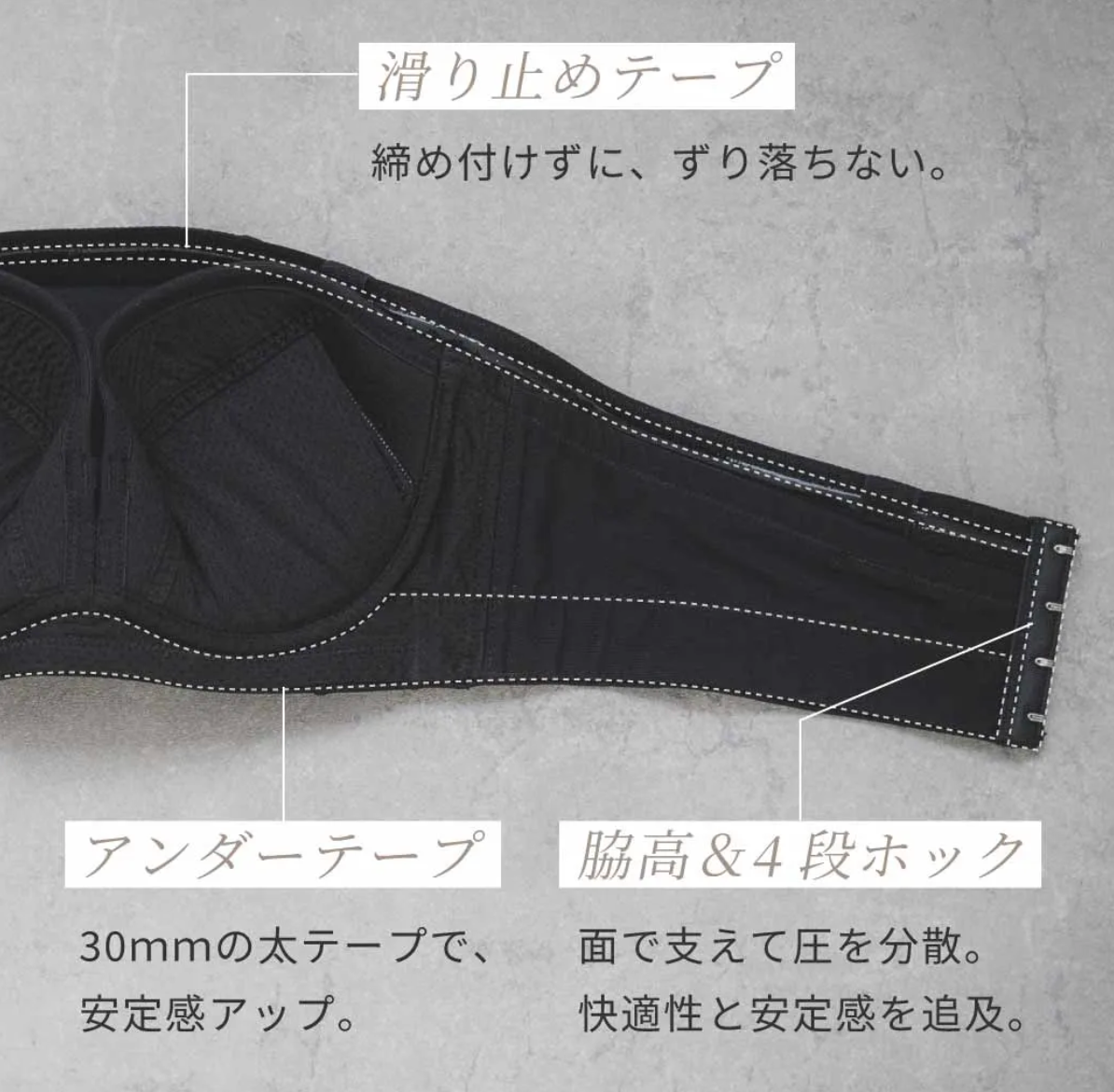 締め付けないのにしっかりホールド。ズレにくいのにバストを潰さない。ストラップレスなのにメリハリバスト。その特徴は以下の4つです。