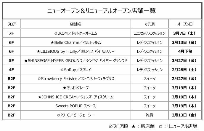 そのほか、地下2階ではフロア全体のイートインスペースを拡充し、「Strawberry Fetish+」「PJ_C」など人気店舗がリニューアルオープン。さらにアパレルフロアでは、4階「SpRay」や7階「.KOM」が新たな装いでリニューアルオープンとなり、新規出店、改装店、POPUP含む計10店舗が2月下旬から4月下旬にかけて順次オープンします。