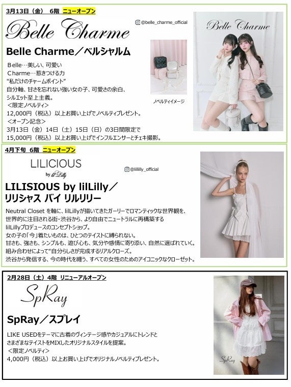 株式会社SHIBUYA109エンタテイメント(本社:東京都渋谷区、代表取締役社長:石川あゆみ)が東京・渋谷で運営する施設「SHIBUYA109渋谷店」では、2026年春、トレンドスイーツおよびレディスブランドを中心とした新規出店・リニューアルを実施いたします。