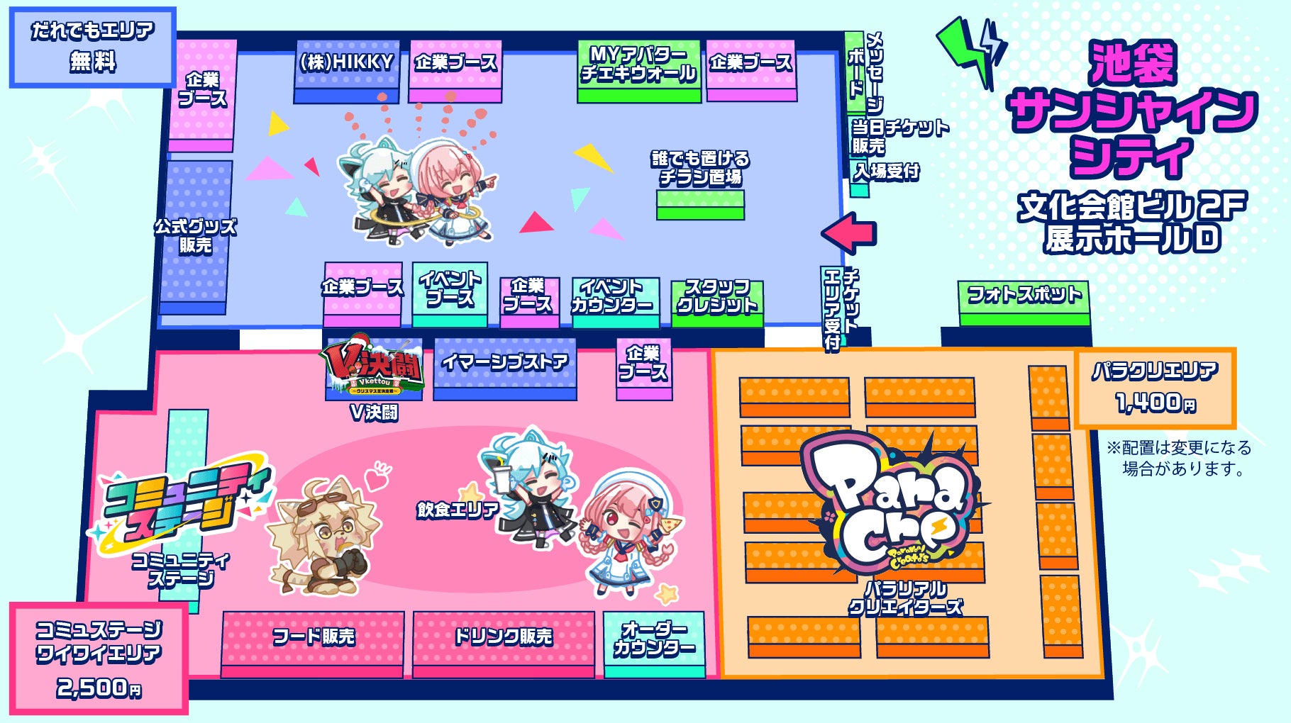 有料ゾーンは二つのエリアで構成。毎回長蛇の列ができる程の人気クリエイターたちが集まる「パラクリエリア」に加えて、「イマーシブストア」や「V決闘」などバーチャル空間と現実を結んで相互に楽しめるアトラクションや、VRChatで人気のコミュニティによるライブやパフォーマンスなどが楽しめる「コミュステージワイワイエリア」も用意しました。