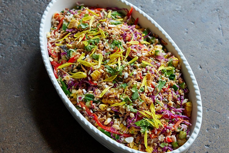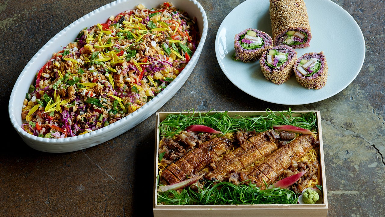 鰻の蒲焼を、華やかな香りのジャスミンライス、ナッツのようなコクと風味のスペルト小麦と合わせた、食べごたえのある栄養たっぷりなデリ惣菜。オクラ、キュウリ、トウモロコシなどの夏野菜、食用菊も散らし、ハーブとナンプラーのドレッシングでエスニックに仕上げています。