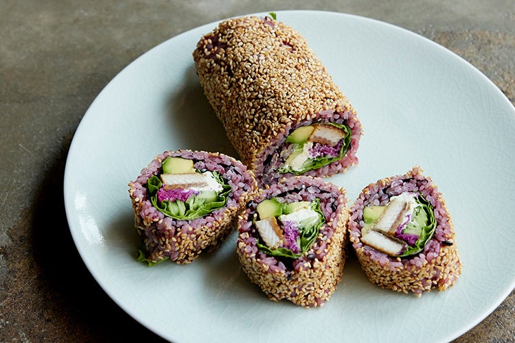 黒米を加えた赤い酢飯に、鰻の蒲焼、アボカド、クリームチーズを巻き、白ごまをたっぷりまぶして仕上げました。濃厚なクリームチーズと甘じょっぱい蒲焼の相性もよく、お子さまも食べやすい味わいです。