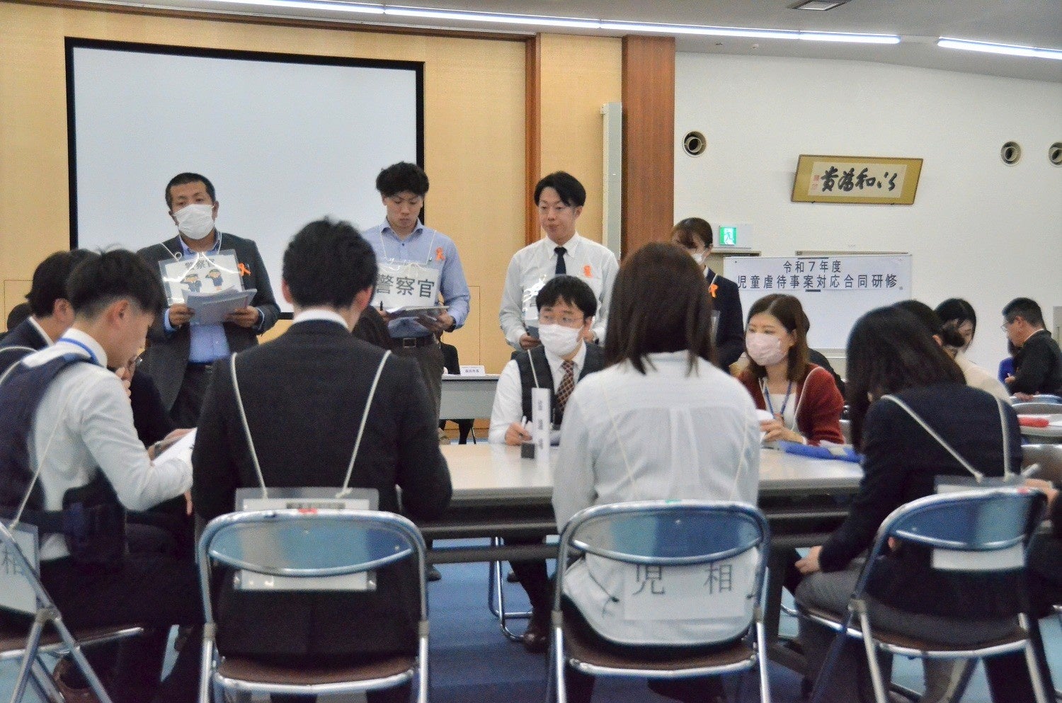 当日は、奈良県内19市町村から職員26名、県職員3名、県内の児相職員29名(奈良県中央こども家庭相談センター・奈良県高田こども家庭相談センター・奈良市子どもセンター)、奈良県内12警察から警察官16名の計74名が参加。警察と児童相談所及び要保護児童対策地域協議会等がお互い職務の理解を深め、より一層の連携強化を図り、児童虐待事案対応時における現場執行力を高めようと、意見交換やロールプレイの想定訓練に取り組みました。