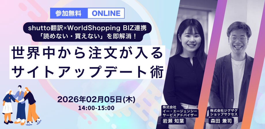 “おもてなしを科学する”株式会社イー・エージェンシー(本社:東京都千代田区、代表取締役:甲斐真樹、以下イー・エージェンシー)が提供するプロダクトブランド『さぶみっと!』のひとつ、ウェブサイト翻訳ツール『shutto翻訳』は、2026年2月5日(木)、株式会社ジグザグ(本社:東京都渋谷区、代表取締役:仲里 一義)と共同ウェビナーを開催します。本セミナーでは、拡大する越境EC市場において成約の壁となる「言語・決済・配送」の課題解決をテーマに、サイト改善の成功事例や期間限定キャンペーンについて詳しく解説します。
