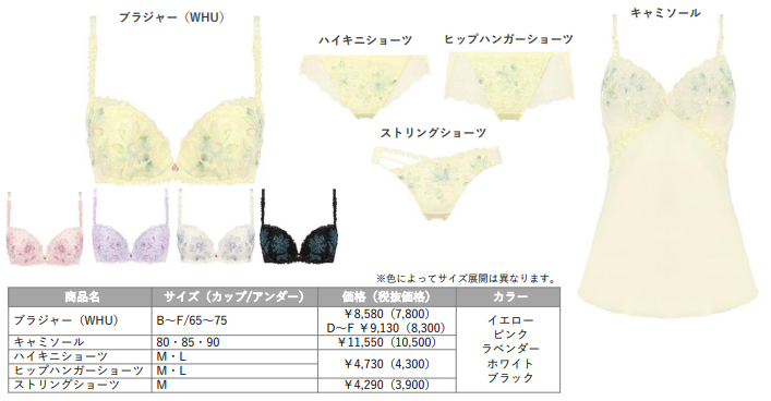 アンダーバストやストラップに沿わせたレースが、まるでアクセサリーのよう。サンパラソルの花の刺しゅうが胸元で踊る、キュートなシリーズです。イエローやピンク、ラベンダーなど、5色の選べるバリエーションも魅力。ブラジャー(WHU)は、小ぶりのパターンで軽やかな着けごこち。サイドからバストを中央に寄せ、ふっくらとした胸元をメイクします。取り外し可能なパッド入りです。